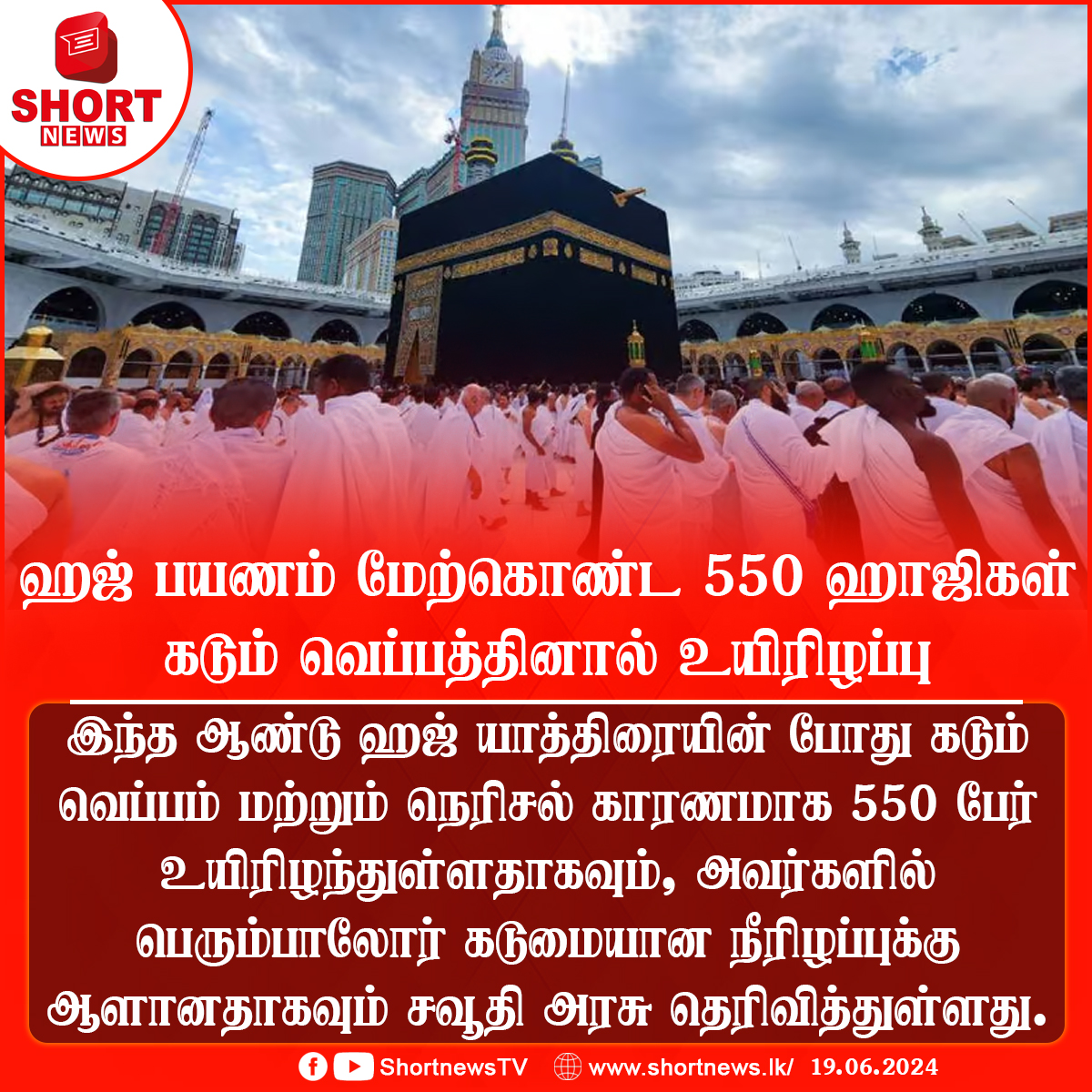 இந்த ஆண்டு ஹஜ் யாத்திரையின் போது 550 பேர் உயிரிழந்துள்ளதாக சவூதி அரசாங்கம் அறிவித்துள்ளது. ஹஜ் யாத்திரையின் போது கடும் வெப்பம் மற்றும் நெரிசல் காரணமாக இந்த உயிரிழப்புகள் பதிவாகியுள்ளதாக அரசாங்கம் கூறுகிறது.